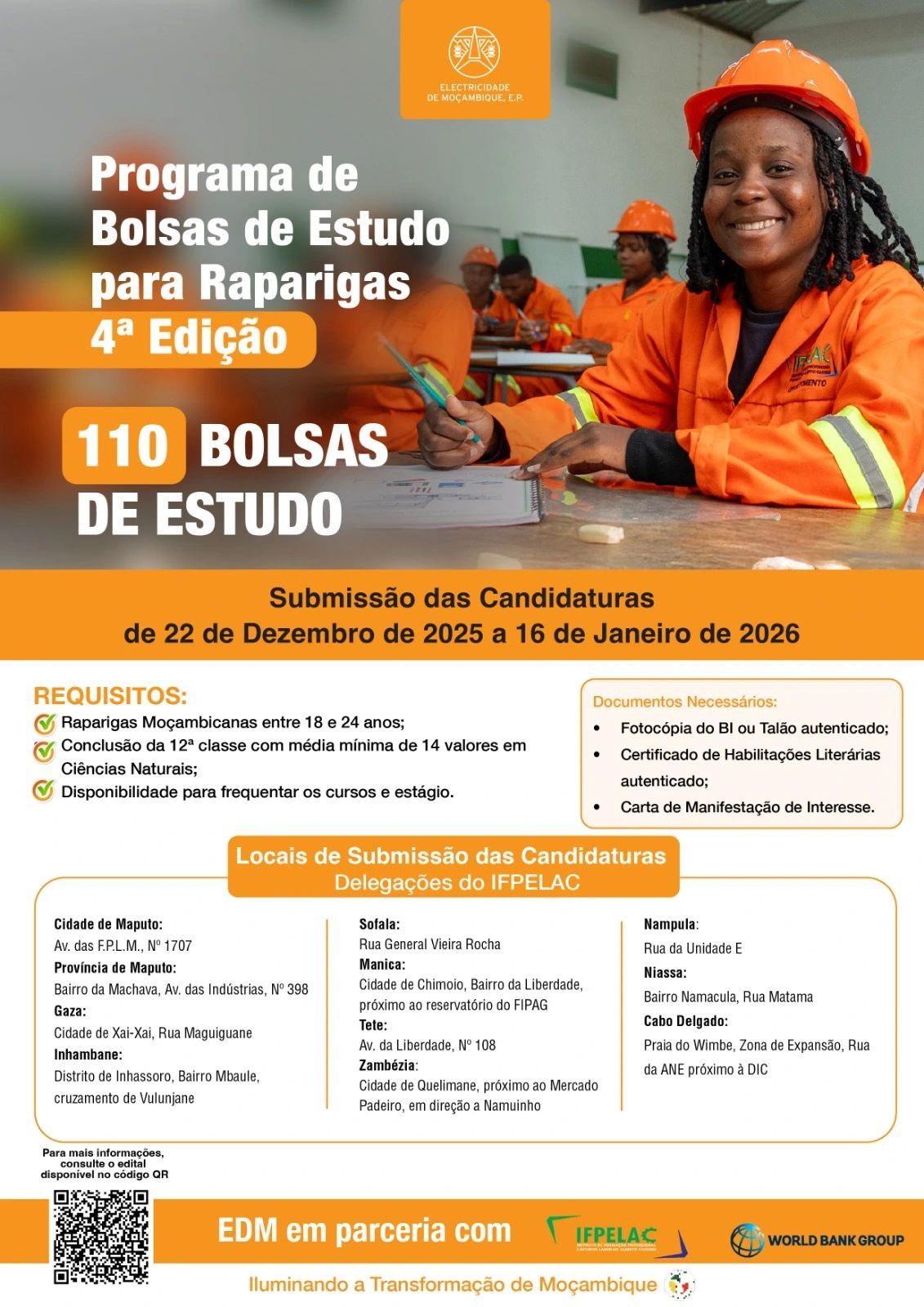 Nesse contexto, estão abertas as candidaturas para a 4ª Edição do Programa de Bolsas de Estudo para Raparigas, uma iniciativa da EDM, em parceria com o IFPELAC e o World Bank Group.