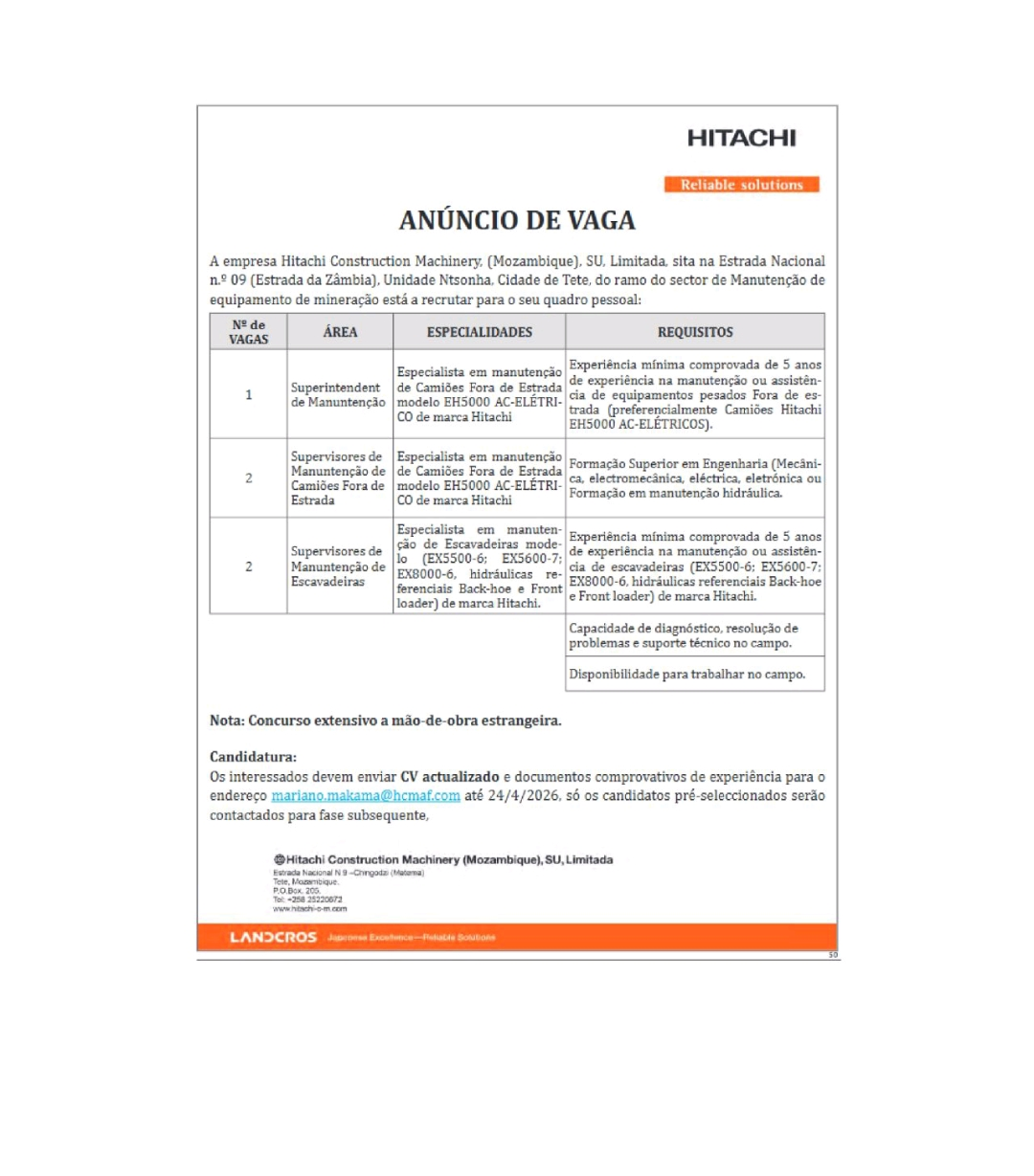 A Hitachi Construction Machinery (Moçambique), SU, Limitada pretende recrutar profissionais para os seus quadros no sector da manutenção de equipamentos mineiros na Cidade de Tete.