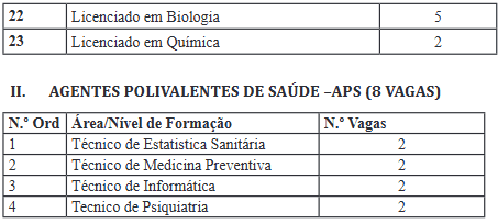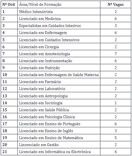 Técnicos Especializados em Cuidados Intensivos (7 vagas), Técnicos Especializados em Instrumentacao (7 vagas), Tecnicos de Nutricão (6 vagas), Técnicos de Farmacia (10 vagas), Tecnicos de Medicina Geral (6 vagas), Enfermagem Geral (8 vagas), Enfermagem de Saude Materno-Infantil (12 vagas) e Agentes Polivalentes de Saúde (6 vagas), conforme a demostração e condições definidas abaixo: