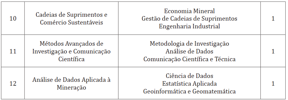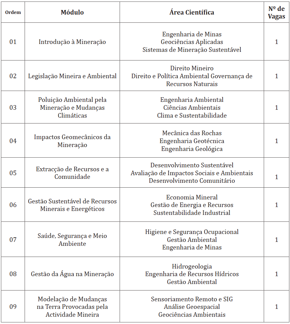 1. De acordo com o Despacho de 7/10/2025 do Director-Geral e nos termos do artigo 21 do Estatuto Geral dos Funcionários e Agentes do Estado, conjugado com os artigos 5 e 6 do Regulamento do Estatuto Geral dos Funcionários e Agentes do Estado, a Direcção de Serviços Centrais de Administracao e Financas anuncia a abertura de Concurso Publico de Contrataçao Fora do Quadro (Docência) do ano académico 2025 – 1ª Ediçao, para o Curso de Mestrado em Mineração Sustentável, conforme a tabela abaixo: