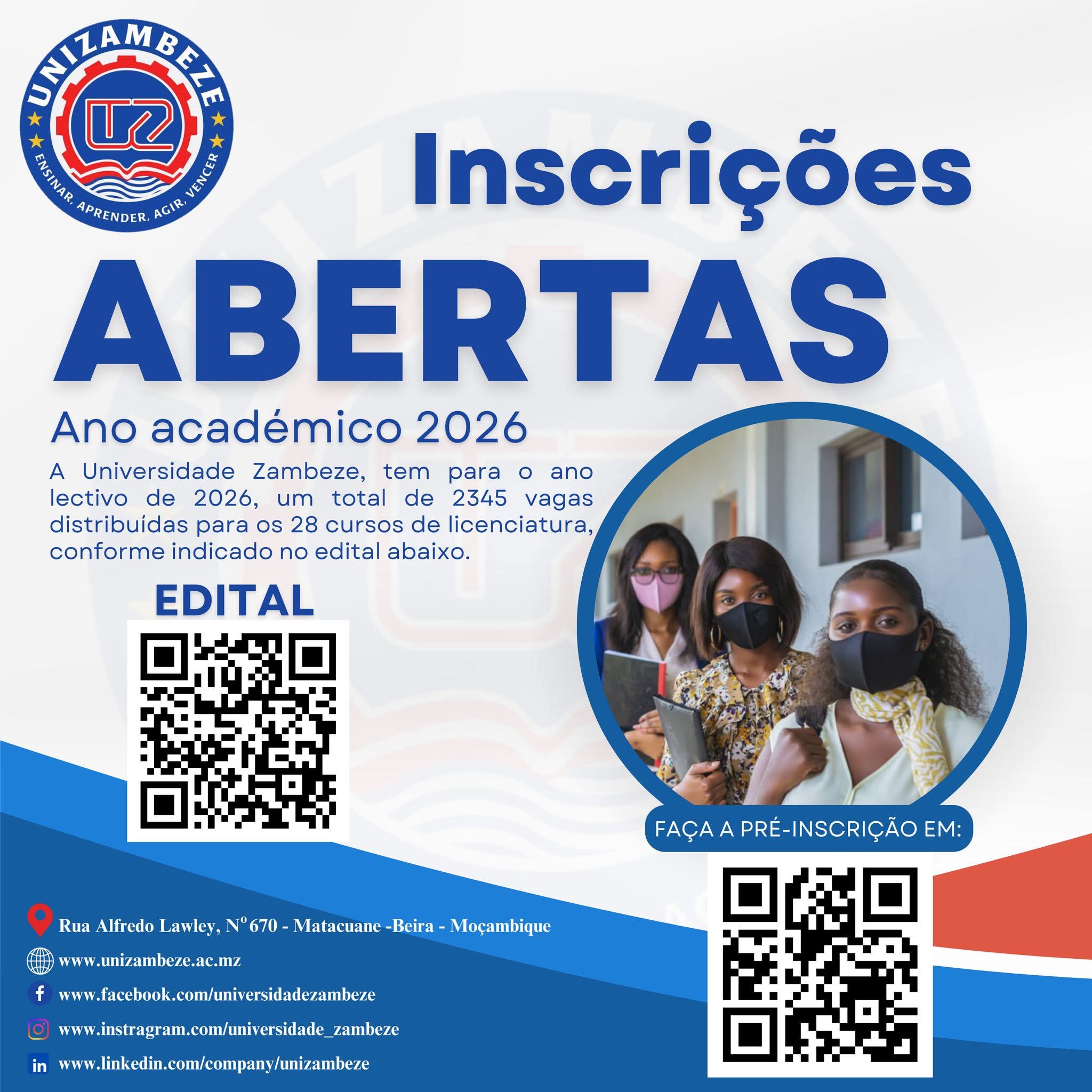 Para o Ano Lectivo – 2026, a UniZambeze disponibilizará 2.345 vagas cm 28 cursos de Licenciatura, reafirmando o seu compromisso com a formação de quadros qualificados e com o desenvolvimento sustentável do País, da região e do mundo.