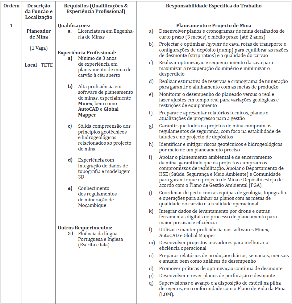Minas de Benga, Limitada (ICVL) é uma empresa do sector mineiro com a sede na Avenida 24 de Julho, n.º 1123, 4.º Piso, Edíficio 24, Cidade de Maputo, com operações nas províncias de Tete e Sofala. No âmbito do seu plano estratégico e de negócio pretende reforçar o seu quadro do pessoal em diversas áreas. Para o efeito, pretende levar a cabo um processo de recrutamento de potenciais candidatos que reúnam os requisitos abaixo: