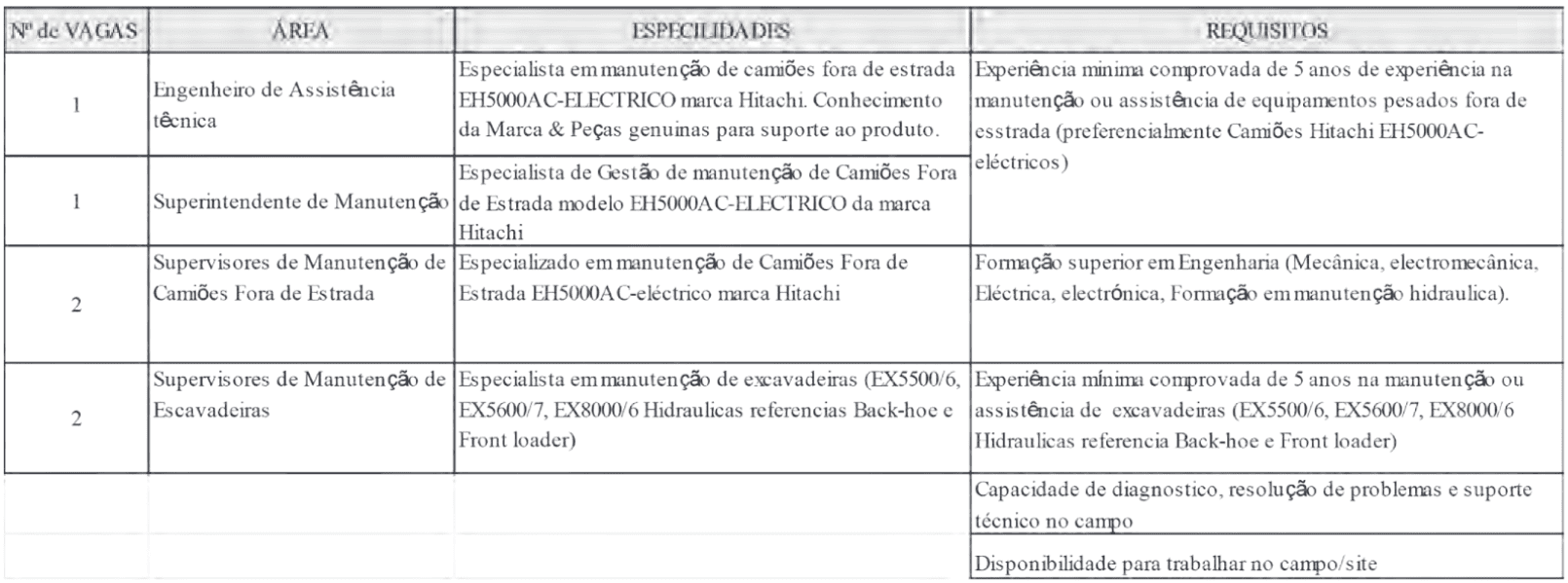 A Empresa Hitachi Construction Machinery, (Mozambique), SU, Limitada, sita na Estrada Nacional n.º 9 (Estrada da Zâmbia), Unidade Ntsonha, Cidade de Tete do sector de Manutenção de Equipamento de Mineração está a recrutar para seu quadro pessoal: