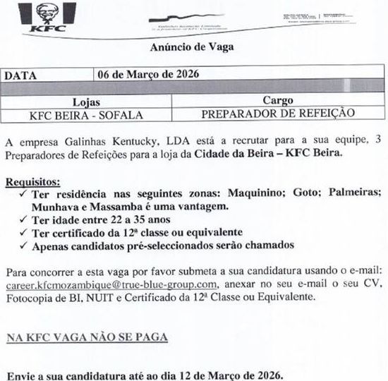 Para concorrer a esta vaga por favor submeta a sua candidatura usando o e-mail: career.kfcmozambique@true-blue-group.com, anexar no seu e-mail o seu CV. Fotocopia de BI, NUIT e Certificado da 12ª Classe ou Equivalente.