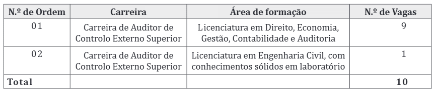 Havendo necessidade de reforçar o quadro de pessoal desta Instituição com profissionais formados nas áreas abaixo discriminadas, torna-se público, que por Despacho de 24 de Outubro de 2025, da Veneranda Presidente deste Tribunal, encontra-se aberto o concurso de ingresso para o provimento de 10 (dez) vagas na carreira de Auditor de Controlo Externo Superior.