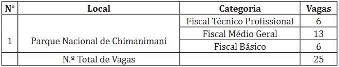 contratação de 25 Fiscais Florestais, vagas estas que serão suportadas através dos fundos da Fauna e Flora, é publicado o anúncio conforme a tabela abaixo: