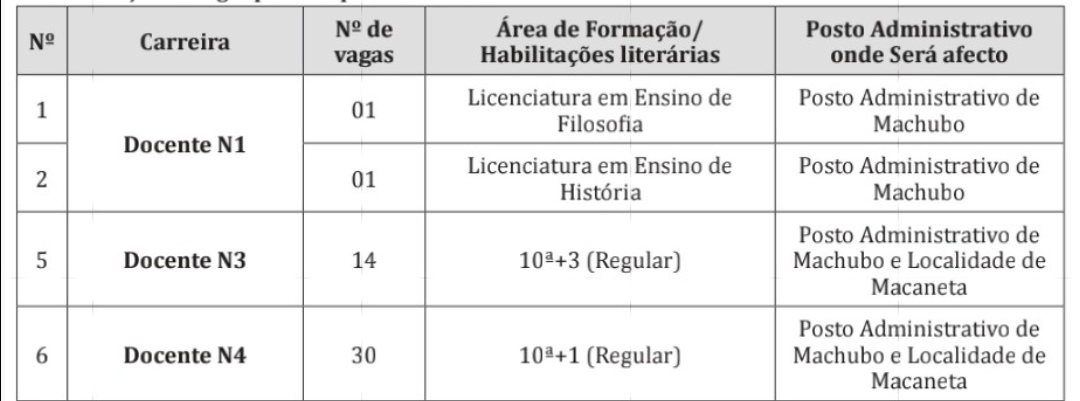 1. De acordo com o Despacho de 11 de Janeiro de 2022, da Exma. Senhora Secretária Permanente do Distrito, torna-se público que está aberto um concurso para ingresso no Aparelho de Estado, para o provimento de 2 vagas na carreira de Docente N1, 14 na carreira de Docente N3, 30 na carreira de Docente N4, existentes no Quadro de Pessoal do Serviço Distrital de Educação, Juventude e Tecnologia de Marracuene, nos termos do artigo 1 do Regulamento do Subsistema de Carreiras e Remuneração, aprovado pelo Decreto n? 30/2018, de 22 de Maio conjugado com a Resolução n® 8/2002, de 22 de Maio, em observância ao Diploma Ministerial n® 88/2005, de 28 de Abril (que aprova o regulamento de concurso para as carreiras de Regime Especial da Educação) e o Diploma Ministerial n® 61/2000, de 5 de Julho (que aprova o regulamento de concursos nas carreiras de regime geral e especial da área comum do aparelho de Estado).