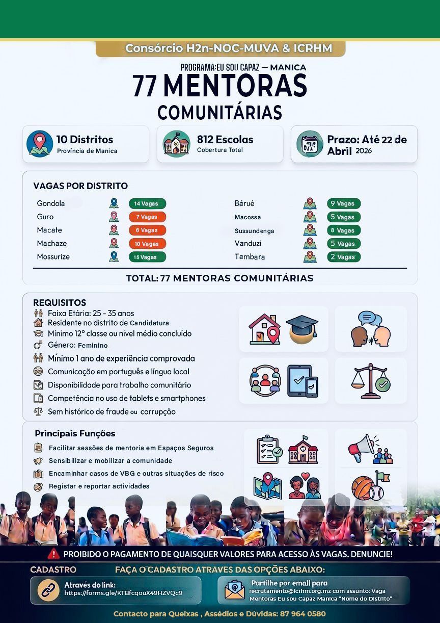 Partilhe por emall para recrutamento@icrhm.org.mz com assunto: Vaga Mentoras Eu sou Capaz Manica “Nome do Distrito”